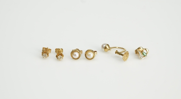 105964. Örhängen 2st Par Samt 2st Udda 18K. Vikt 2,6gr. m.pärlor & stenar
