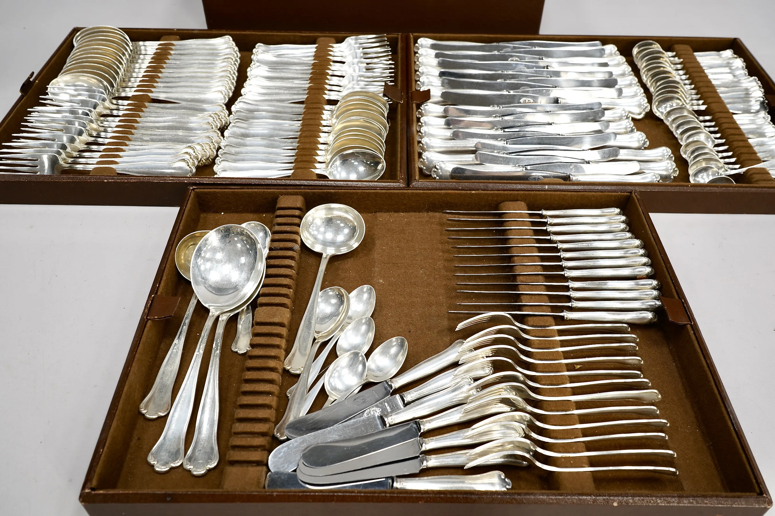 106015. 137-del Bestickuppsättning Silver Modell Kungsholm, Vikt utan knivar 5200Gr. Knivars vikt 2576gr.