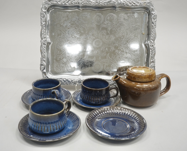 Bertil Ternell 3 st tekoppar + 4 st fat "Kosmos" + tekanna Arabia Finland + rostfri bricka