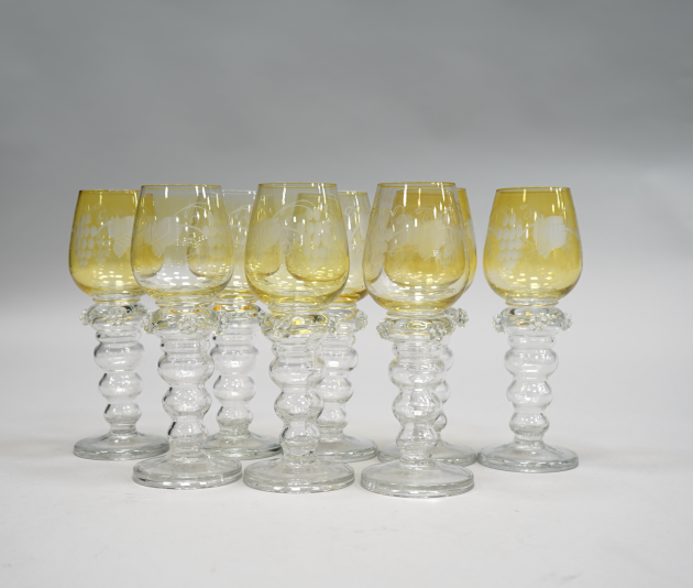 105420. Gullaskruf, 8 st Vitvinsremmare m.Slipad dekor av Vinrankor