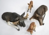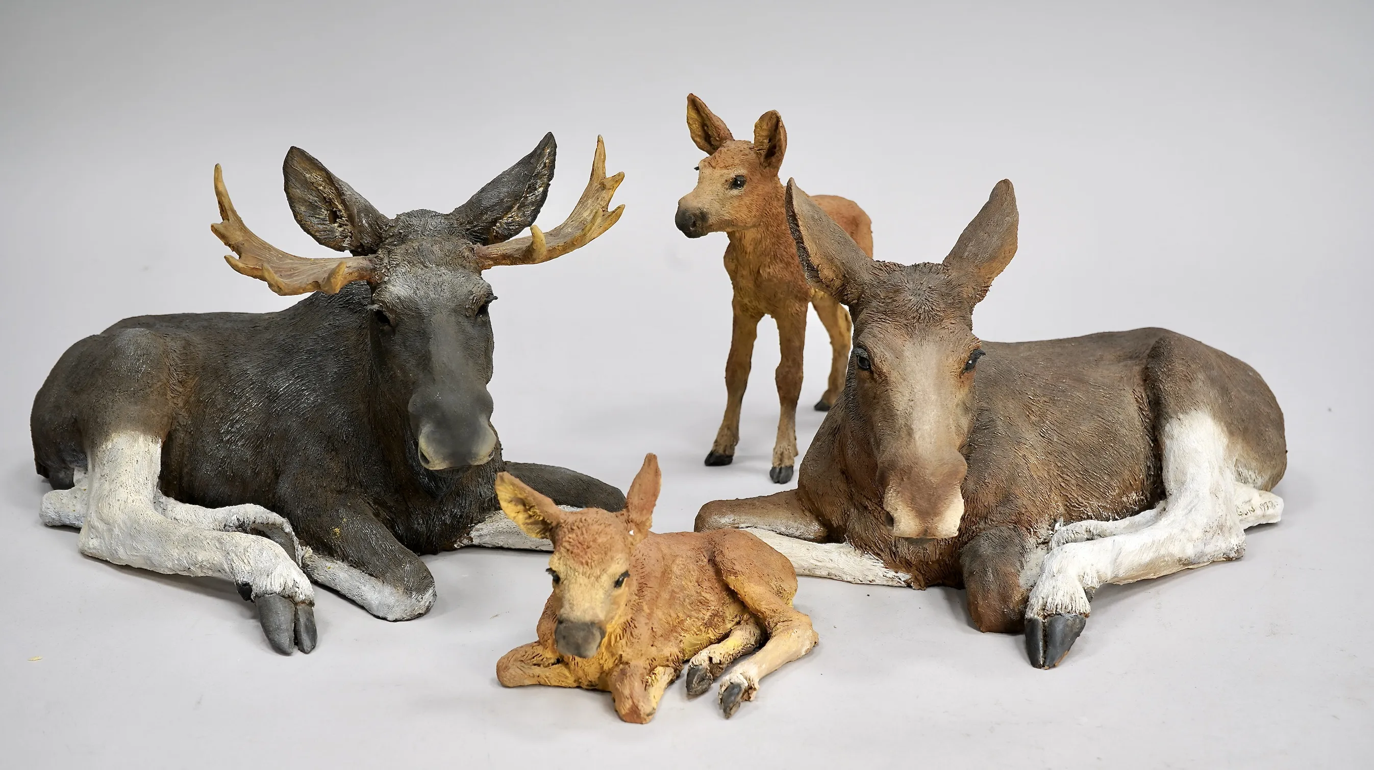 Älgtjur Längd 36cm, Älgko Löngd 34cm, Älgkalvar Ca 18cm Proveniens: Familjen Rülcker (Johnny Rülcker), Gustavsfors Herrgård, 1746 anlade Uddeholmsbolaget ett hammarbruk vid Knoälven vilket kom att bli början på Gustafsfors brukssamhälle. Kring verksbyggnaderna växte bostäder med tillhörande jordbruk upp. I takt med att industrin expanderade förtätades bebyggelsen på orten. På 1860-talet anlades här också en masugn som 1871 kompletterades med ett bessemerverk. Detta kom att tjäna som föregångare till anläggningen i Hagfors. Under slutet av 1800-talet var Gustafsfors Uvåbygdens mest betydelsefulla industriort. Ett flertal av de byggnader som idag kännetecknar orten uppfördes under denna tid. Hit hör arbetarbostäder och ekonomibyggnader i trä eller sindersten intill lämningarna efter hyttan men också kring smedjan och handelsboden. Till samhällets äldsta byggnader räknas gamla förvaltarbostaden och herrgården med skogsbolagets revirkontor, vilka tillhör bruksortens tidigaste byggnader.