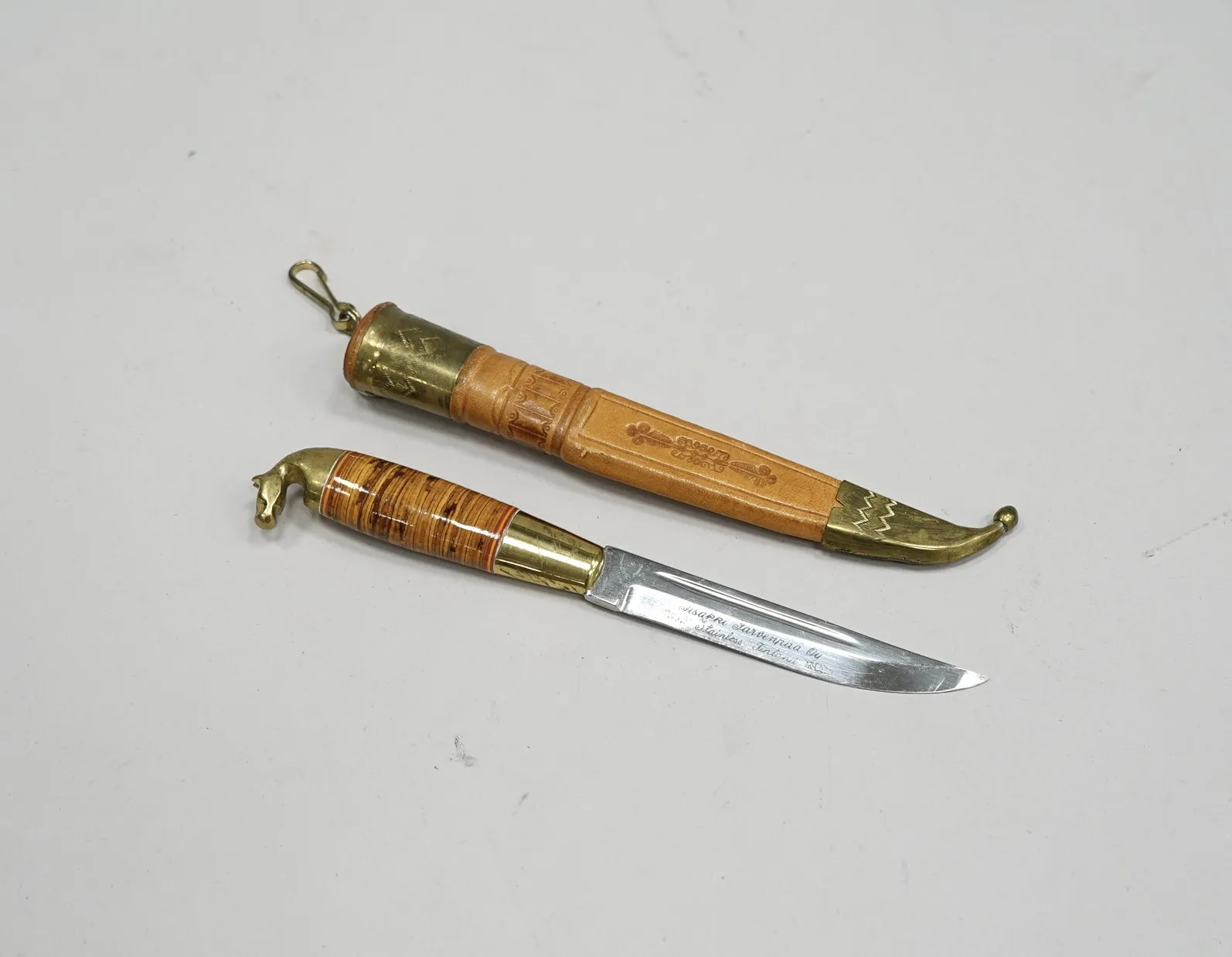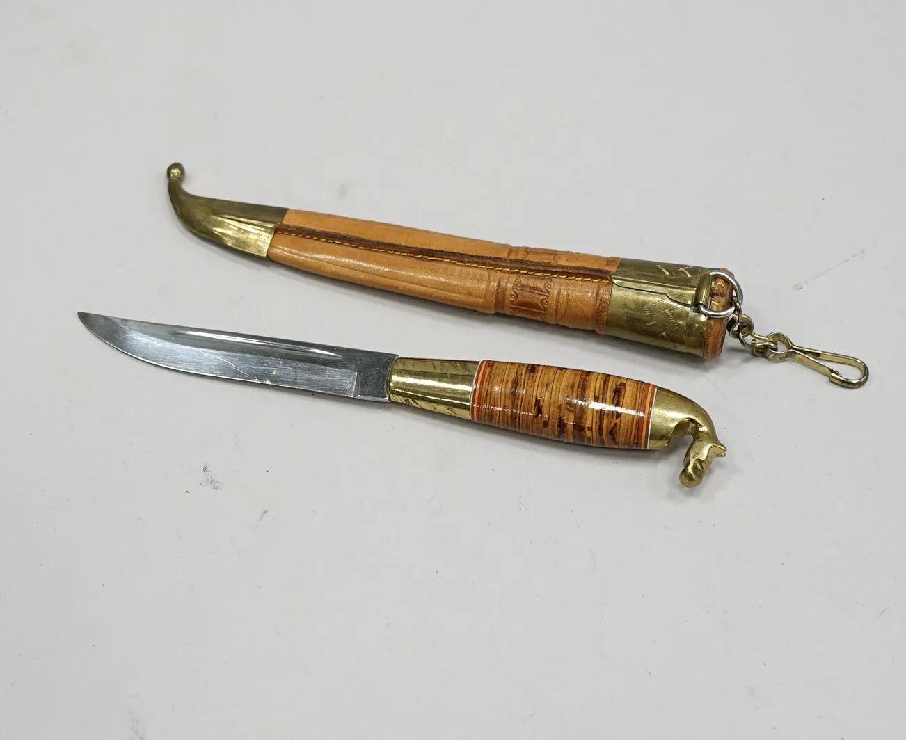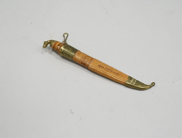 Skaft av masurbjörk och mässing, läderslida med mässing detaljer, signerad på knivbladet, L. 10 cm knivblad. L. 19,5 cm kniv.