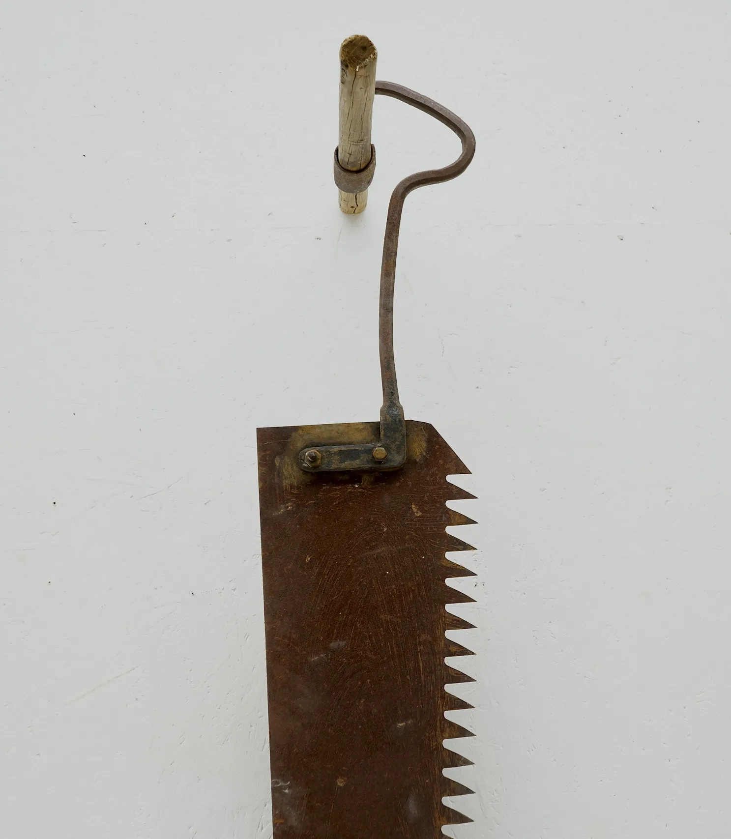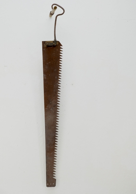 Längd 225cm. slitage, Hålen längst ner användes för att fästa tyngder i när man kom igenom isen för att underlätta sågningen. Proveniens: Familjen Rülcker (Johnny Rülcker), Gustavsfors Herrgård, 1746 anlade Uddeholmsbolaget ett hammarbruk vid Knoälven vilket kom att bli början på Gustafsfors brukssamhälle. Kring verksbyggnaderna växte bostäder med tillhörande jordbruk upp. I takt med att industrin expanderade förtätades bebyggelsen på orten. På 1860-talet anlades här också en masugn som 1871 kompletterades med ett bessemerverk. Detta kom att tjäna som föregångare till anläggningen i Hagfors. Under slutet av 1800-talet var Gustafsfors Uvåbygdens mest betydelsefulla industriort. Ett flertal av de byggnader som idag kännetecknar orten uppfördes under denna tid. Hit hör arbetarbostäder och ekonomibyggnader i trä eller sindersten intill lämningarna efter hyttan men också kring smedjan och handelsboden. Till samhällets äldsta byggnader räknas gamla förvaltarbostaden och herrgården med skogsbolagets revirkontor, vilka tillhör bruksortens tidigaste byggnader.