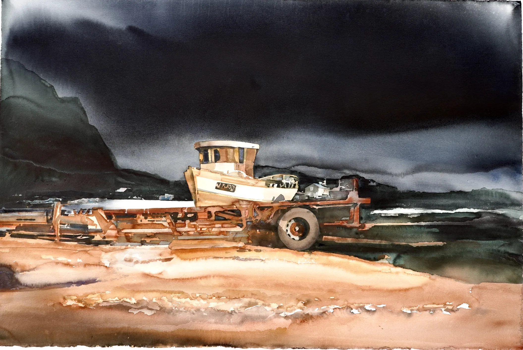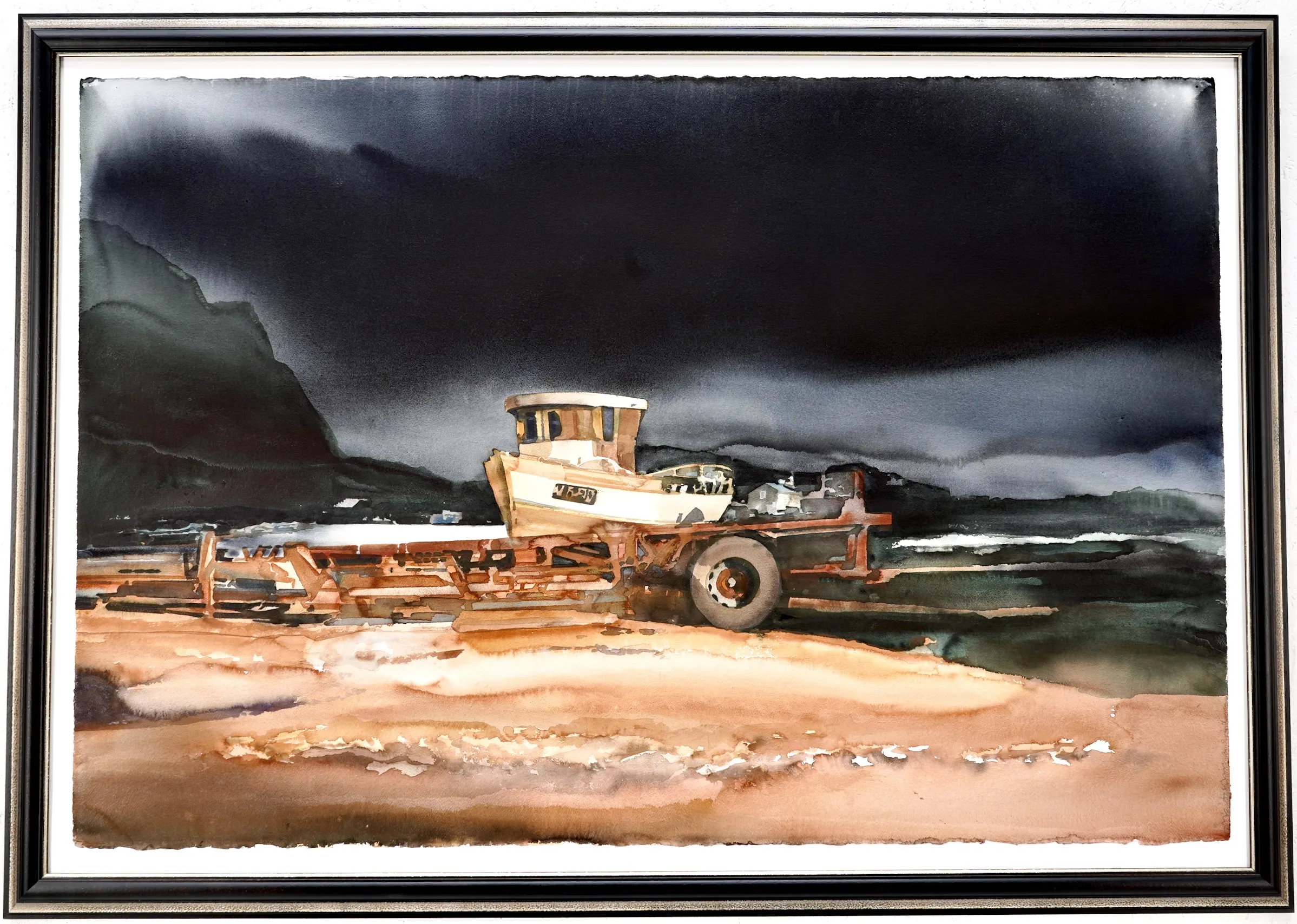 "Uppdragen fiskebåt, Lofoten 2024".Proveniens Lars Lerin, Vi har fått förtroendet att Julstäda i Ateljén o lagren och göra plats till nya projekt (OBS ingen följerätt tillkommer då det är från Konstnären direkt)