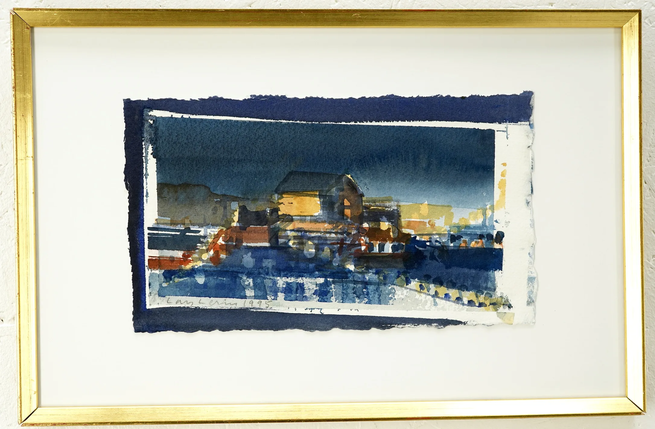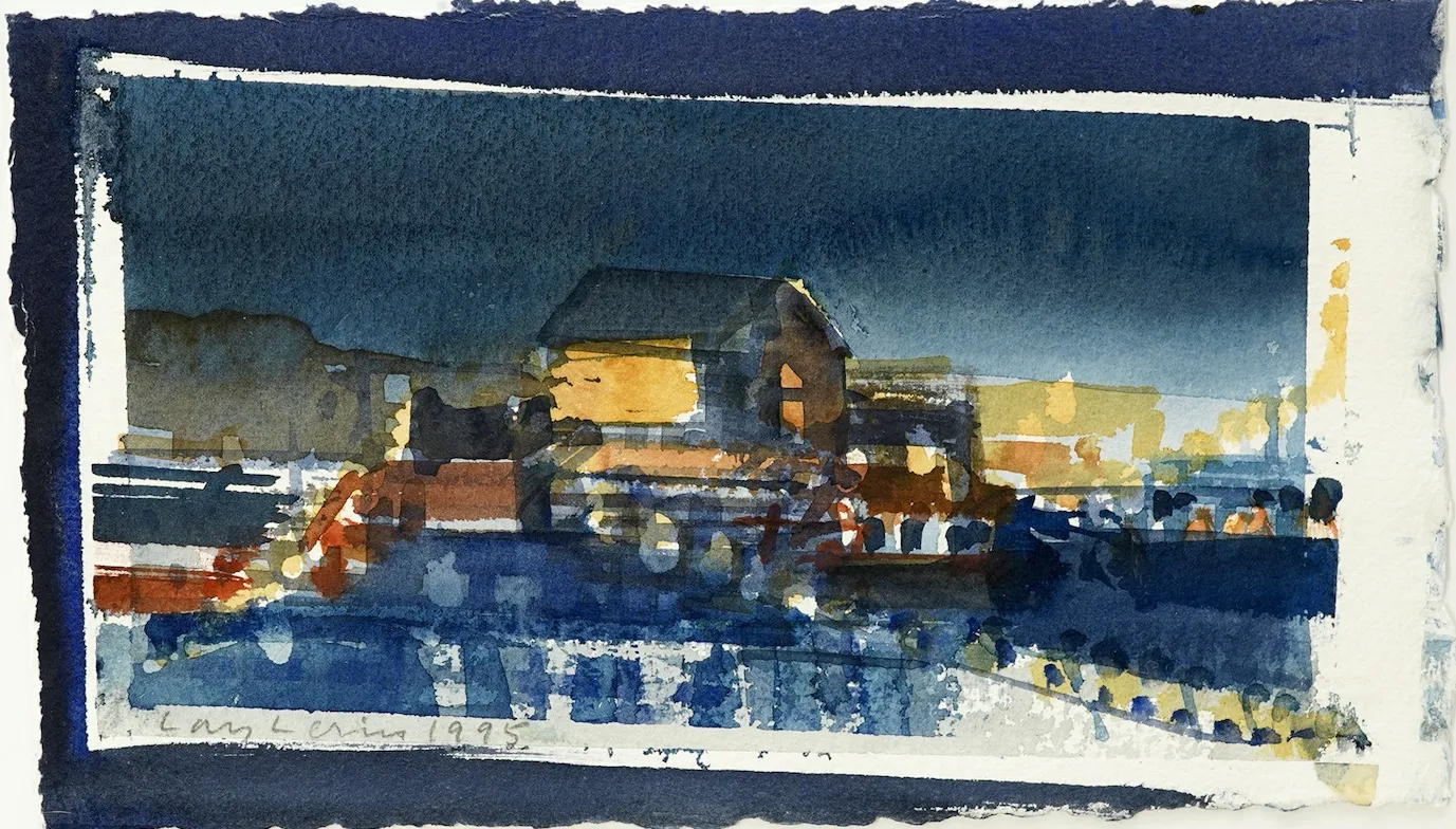 "Hamnmagasin, Natt Lofoten, 1995" Proveniens Lars Lerin, Vi har fått förtroendet att Julstäda i Ateljén o lagren och göra plats till nya projekt (OBS ingen följerätt tillkommer då det är från Konstnären direkt)