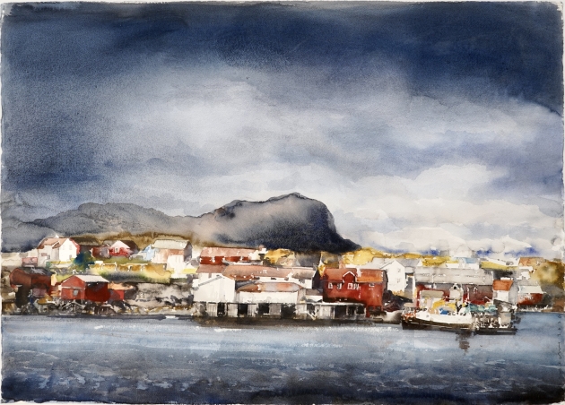 "Lofotenhamn, 2020".Proveniens Lars Lerin, Vi har fått förtroendet att Julstäda i Ateljén o lagren och göra plats till nya projekt (OBS ingen följerätt tillkommer då det är från Konstnären direkt)