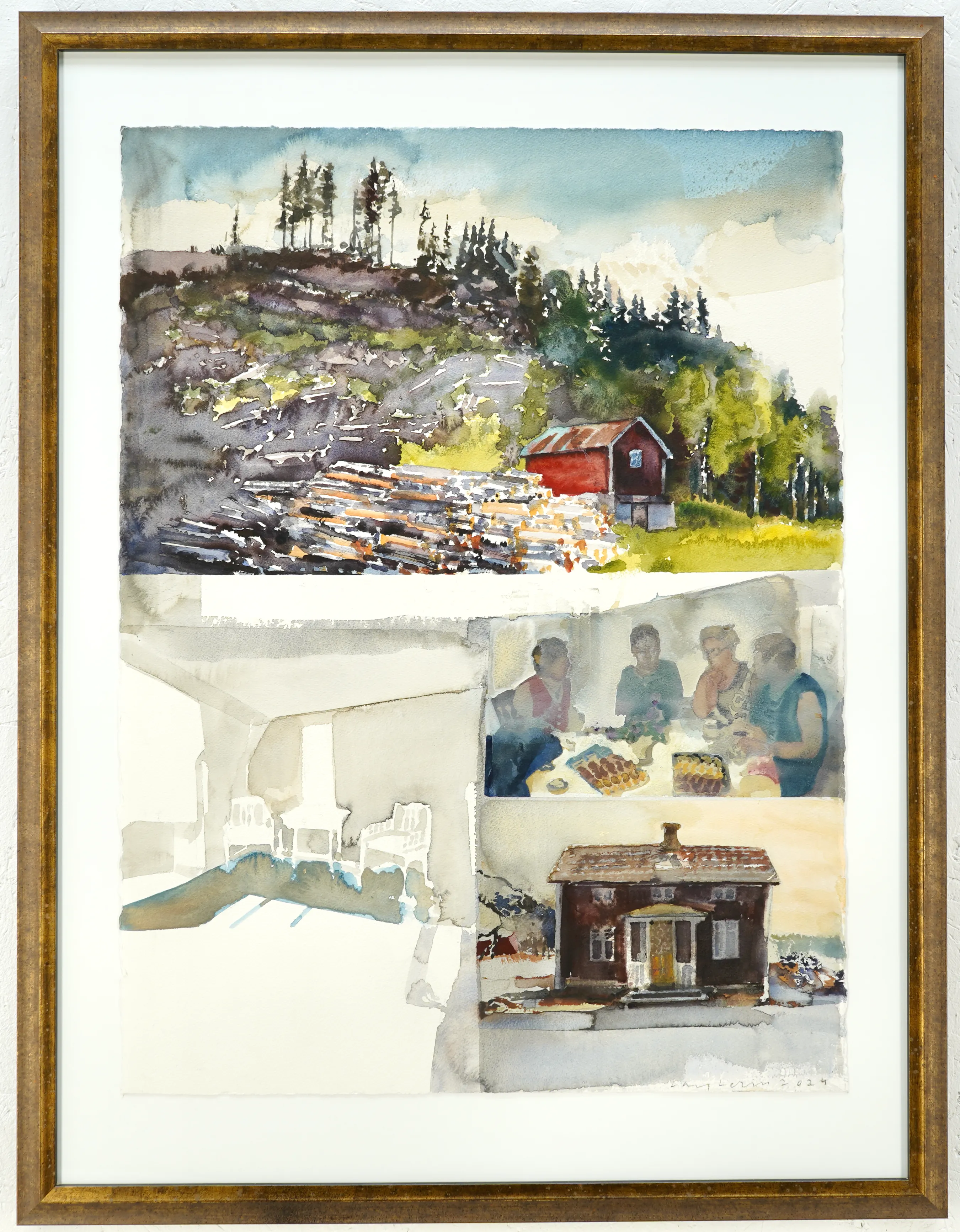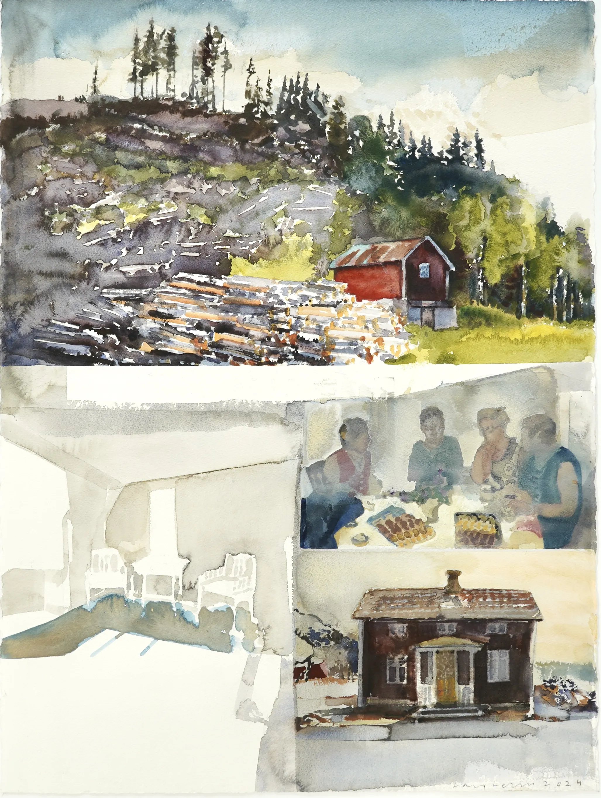 "Bostället, 2024".Proveniens Lars Lerin, Vi har fått förtroendet att Julstäda i Ateljén o lagren och göra plats till nya projekt (OBS ingen följerätt tillkommer då det är från Konstnären direkt)