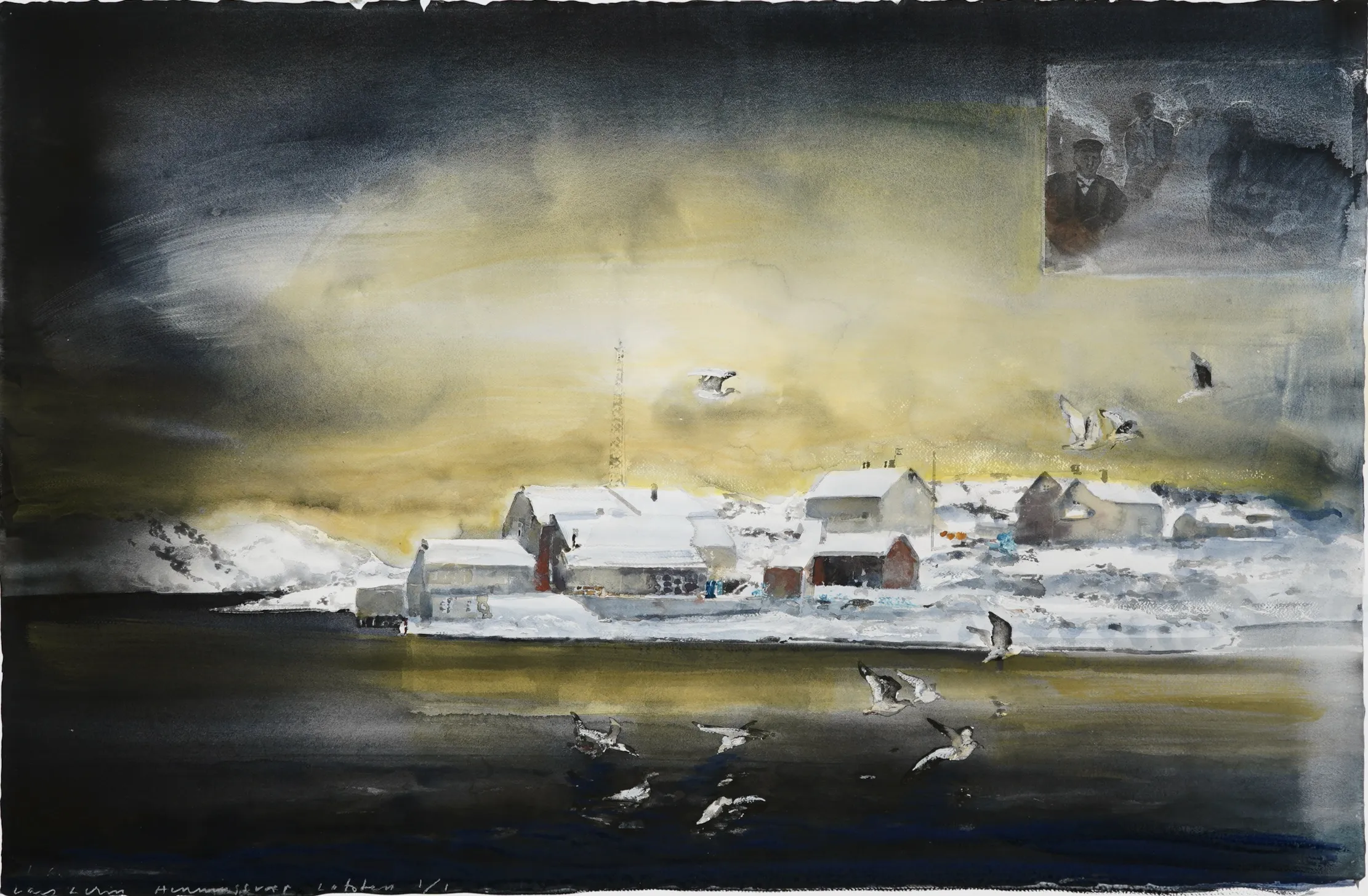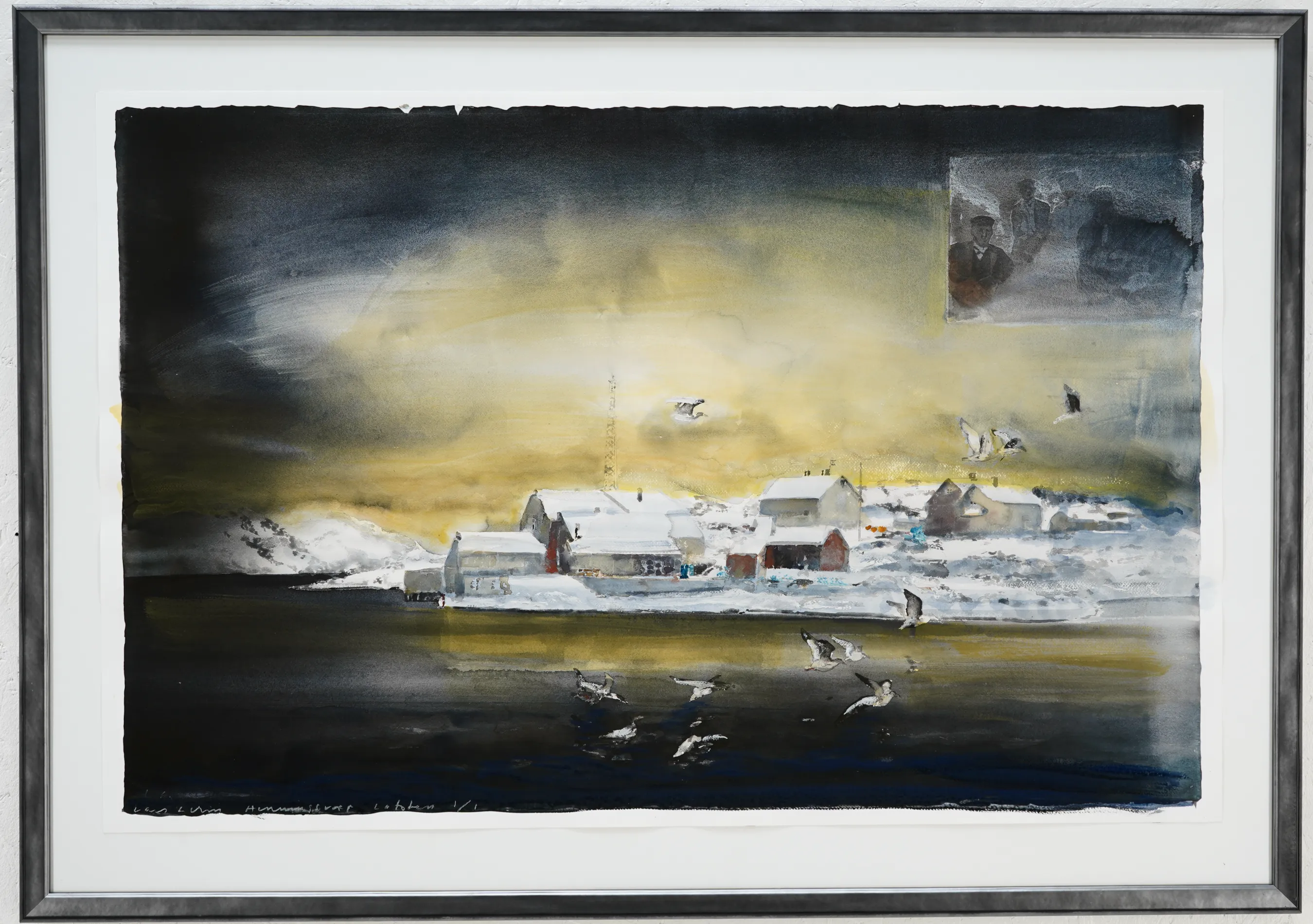 "Henningsvæer, Lofoten" 1/1, Ett unikt ex. Helakvarellerat Pigmentprint,