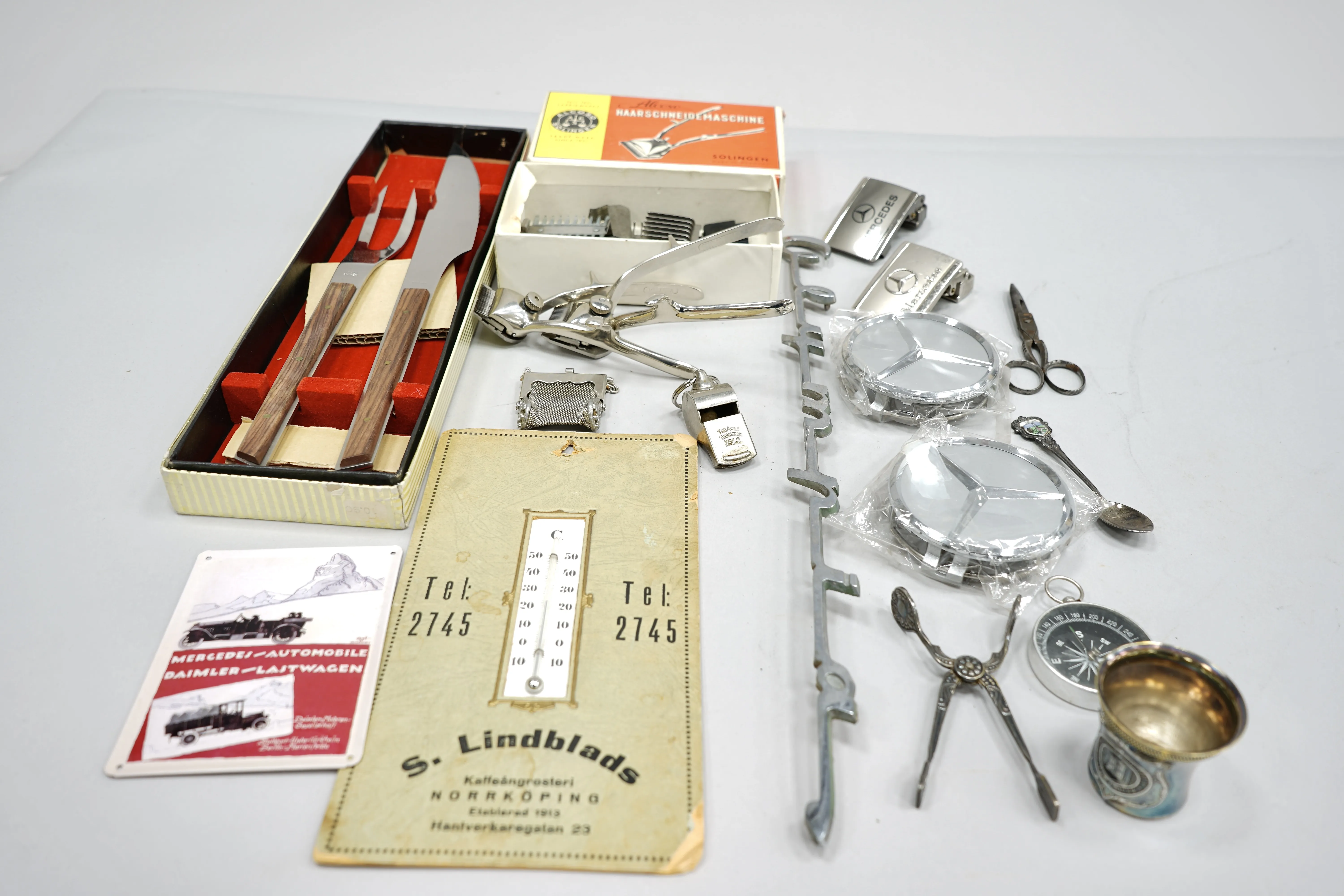 Parti 2 st hårklippare, skinkbestick, Mercedesmärken, bältesspännen mm