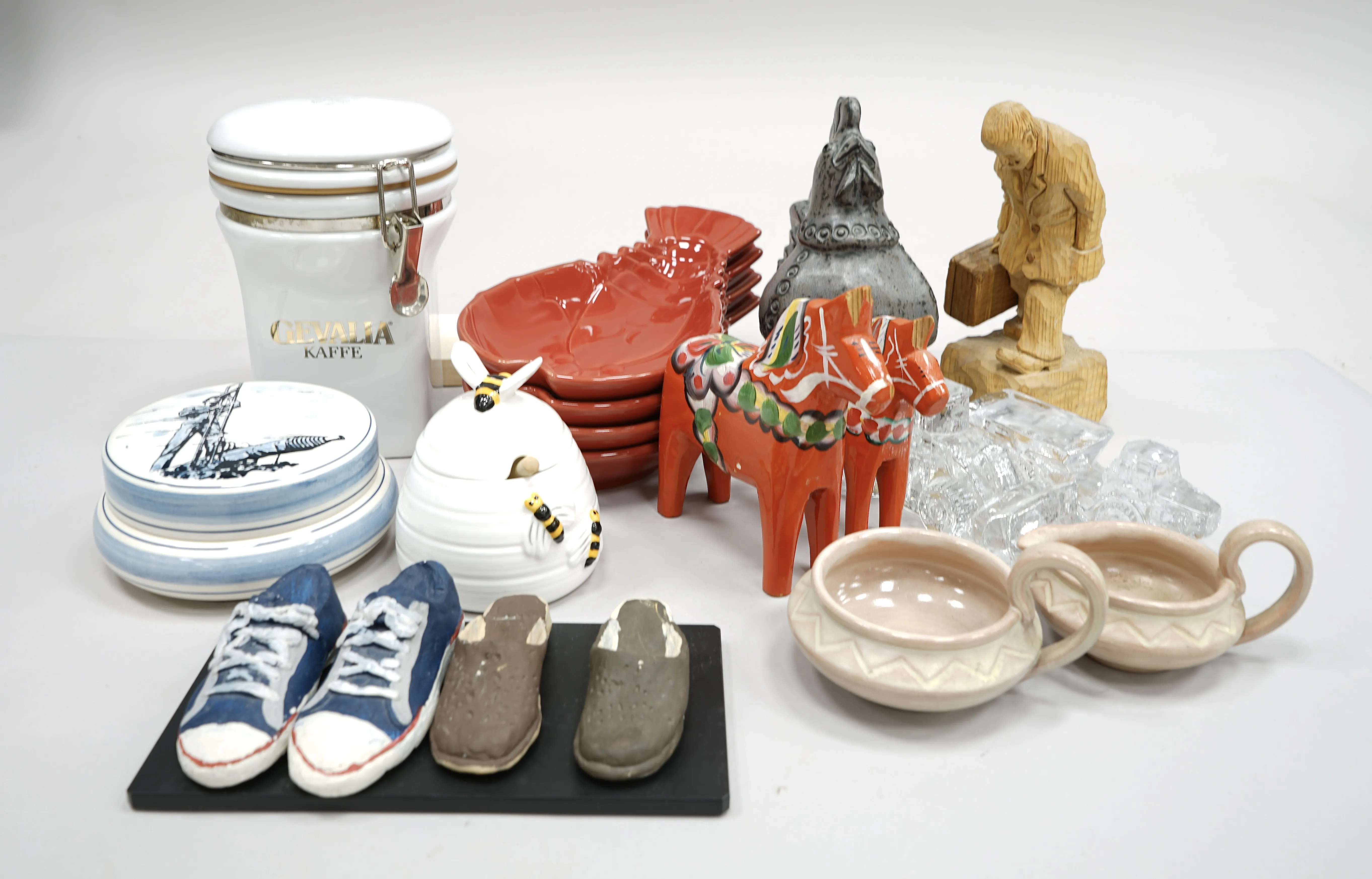 Parti Gevalia kaffeburk, lockask Delft, tupp Höganäs, Dalahästar, kräftfat mm