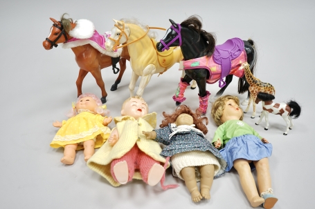 122. Parti hästar med tillbehör hårdplast, 2 st plastdjur, 4 st dockor