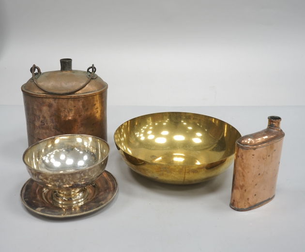 Parti kopparflaska, kopparplunta, mässingskål och såsskål nysilver