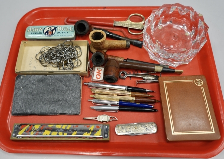 79. Parti pipor, kristallskål, munspel, fällkniv, pennor bl a en ballograf blyerts mm