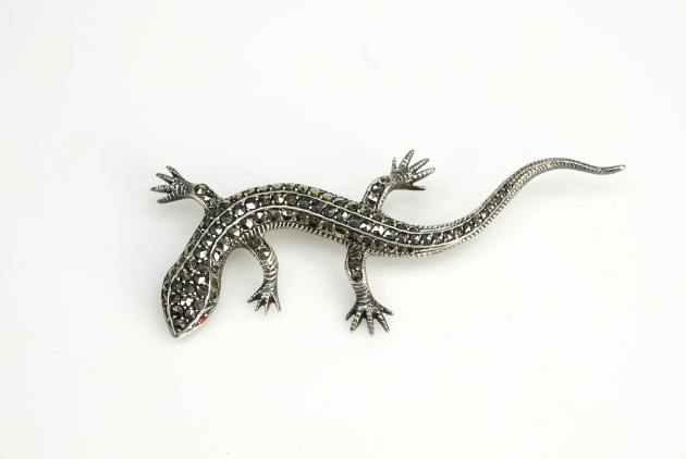 105994. Ödlebrosch Silver, Markasiter m. röda ögon Vikt 10,6gr. Längd 7,5cm